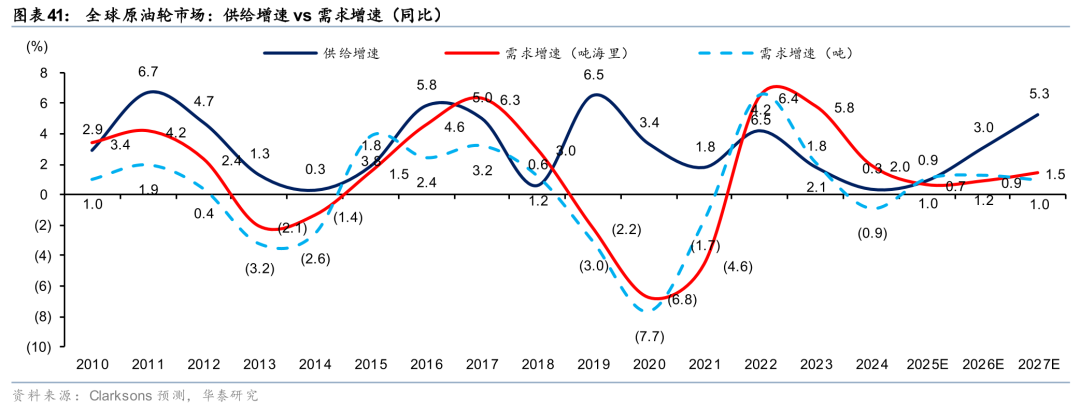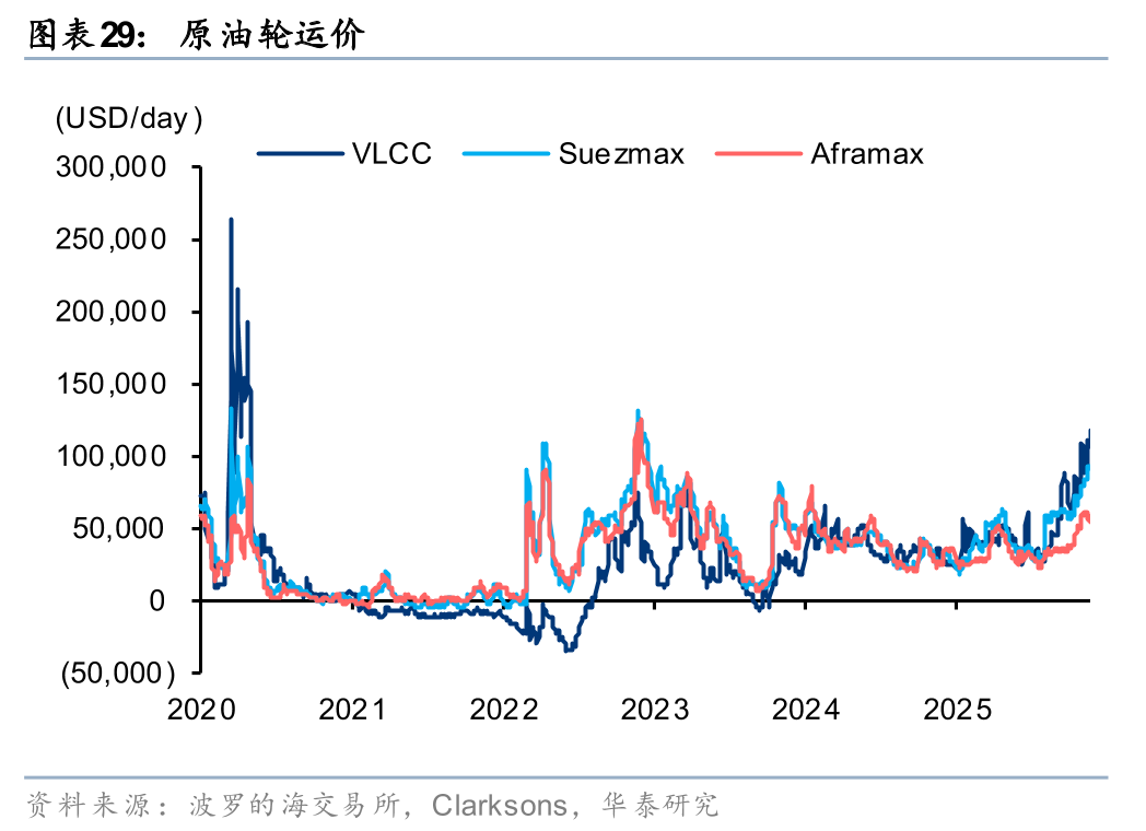 行业供需增速与市场即期运价表现相关性减弱。自2020年以来,全球海运市场受疫情、地缘冲突、中美关税、异常天气等多重因素扰动影响,即期运价表现受到短期市场的供需错配影响,因此即期运价表现走势与年化的行业供需增速预测相关性减弱。展望26年,我们认为尽管原油轮市场表观运力名义增速高于需求增速(年化),但地缘事件扰动、异常天气、油价短期内剧烈波动都将导致市场短期供需出现错配,推涨即期运价。