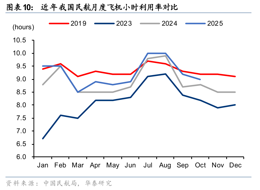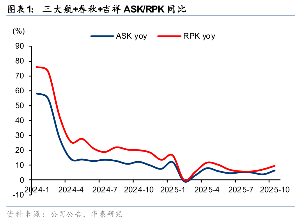 预计26E行业需求增速为5.3%,多因素或可催化其超预期提升。我们仍将民航RPK增速与名义GDP增速挂钩,2020-2024年,受到经济活动不足、因私出行受限、国际线供给压制等影响,民航RPK增速与名义GDP增速的乘数仅为0.3。不过2025年受益于国际线需求较快增长(2025年1-10月国际线RPK同增23.1%),乘数有望回升至2.0。