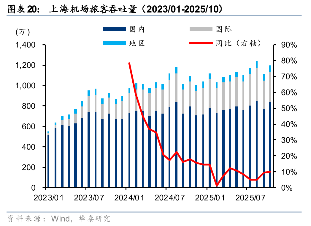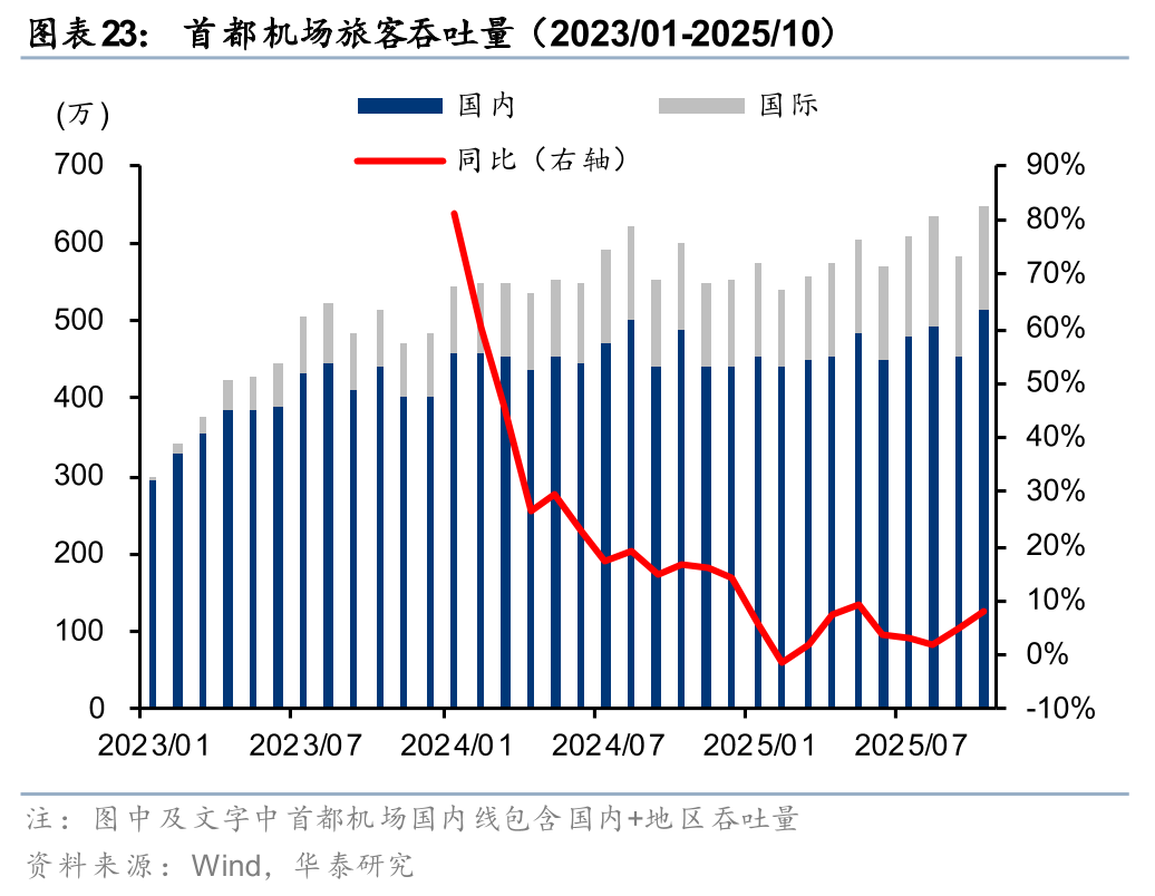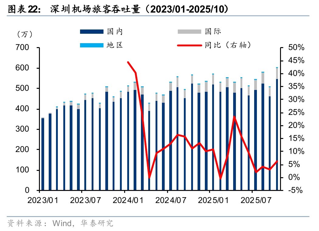 预计整体增速平稳,其中国际线增速继续向常态回落。2025年以来机场流量增速较为平稳,相比2024年有所降低,主要由于国际线基数提升增速放缓。往后展望,民航需求仍将支撑机场流量稳步提升,同时国际线流量由于基本已恢复至疫前水平,其增速或将进一步回落。2025年1-10月,浦东机场、白云机场、深圳机场、首都机场国际线旅客吞吐量分别恢复至2019年同期的97%、91%、108%、60%,其中10月浦东机场、白云机场、深圳机场国际线旅客吞吐量均已超过19年同期水平。