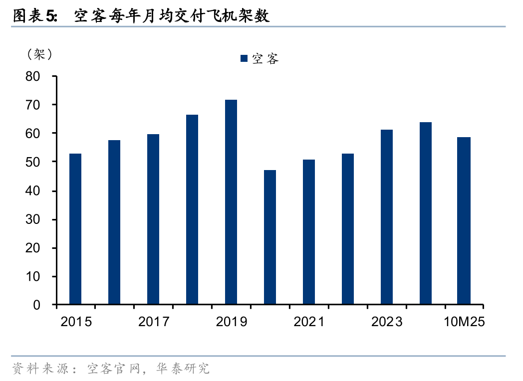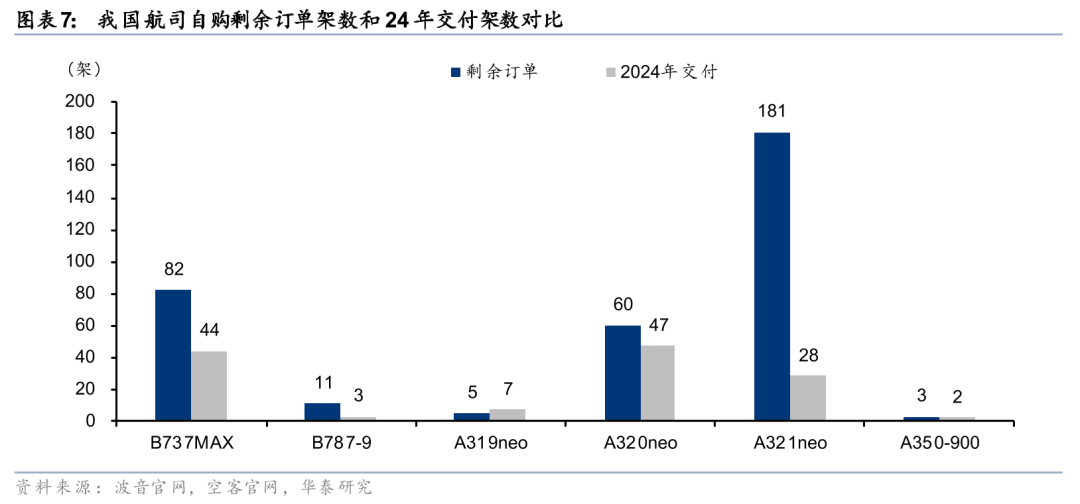 机队有望维持低速增长。主要由于:1)供应链、品控安全性、工程师不足等问题,上游飞机制造商产能仍在恢复过程中。空客2025年1-10月月均交付59架,相比2024年同期提升4.5%,为19年全年的81%;波音2025年1-10月月均交付49架,虽相比2024年同期提升61.6%,但仍只为18年的73%。这也使得我国三大航普遍难以完成引进计划;2)我国航司自购在手订单有限,且新签订单难以在短期内交付。目前我国航司自购剩余波音、空客订单分别为93、249架,除A321neo机型外,或将在1-2年内交付完毕,形成无剩余自购飞机的情况。另外制造商在供应链等问题影响下,形成较多积压订单,我国即使若有新签飞机订单,短期也难以交付,无法提高飞机引进速度。3)我们认为当前我国航司主要诉求为修复资产负债表,恢复盈利水平,通过经营租赁模式积极扩大机队的意愿较低。