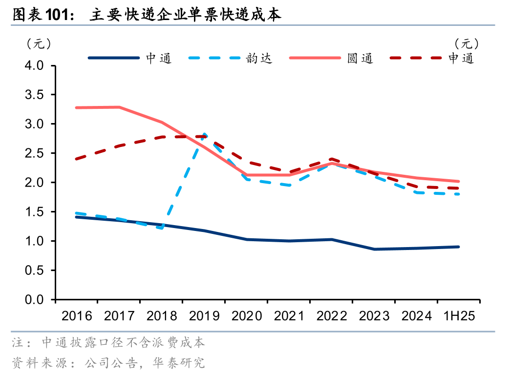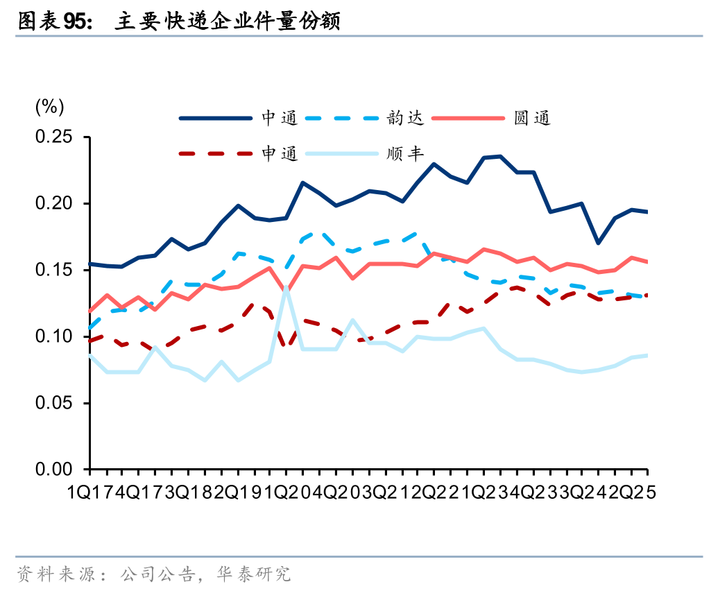 我们认为26年快递行业件量增速将放缓。电商作为快递行业最主要的上游驱动力,26年行业增速预计温和放缓:1)国补效应退坡与同期高基数:2024年10月以来“以旧换新”品类销量高增,部分消费需求前置。2)中小商家出清:电商平台与快递行业双重规范化经营要求下,合规经营成本抬升或造成部分中小商家出清。3)传统电商预计竞争策略稳健:传统电商步入成熟发展期,24年淘宝、拼多多、抖音电商平台均宣布重回GMV战略,25年头部平台将近场电商视为未来核心增量市场,预计26年快递上游的传统电商平台仍将采取稳健竞争策略。
