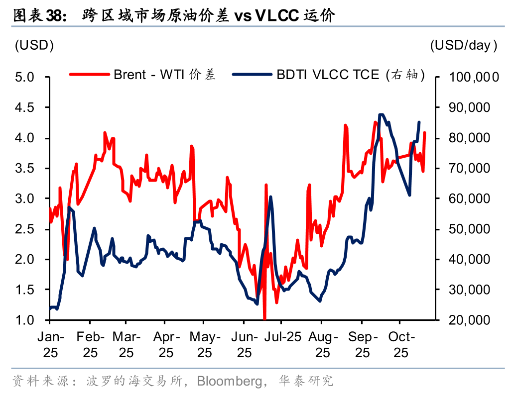 1) 油运:今年以来,国际油运市场呈现“前低后高”走势。其中,原油轮市场表现优于成品油轮。自8月以来,受益于OPEC+/北美/巴西/阿根廷等国增产、跨区域原油价差套利贸易活跃、低油价带动补库需求、地缘事件扰动等多重利好因素共振,VLCC运价呈现大幅上扬态势。