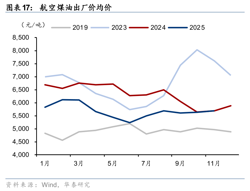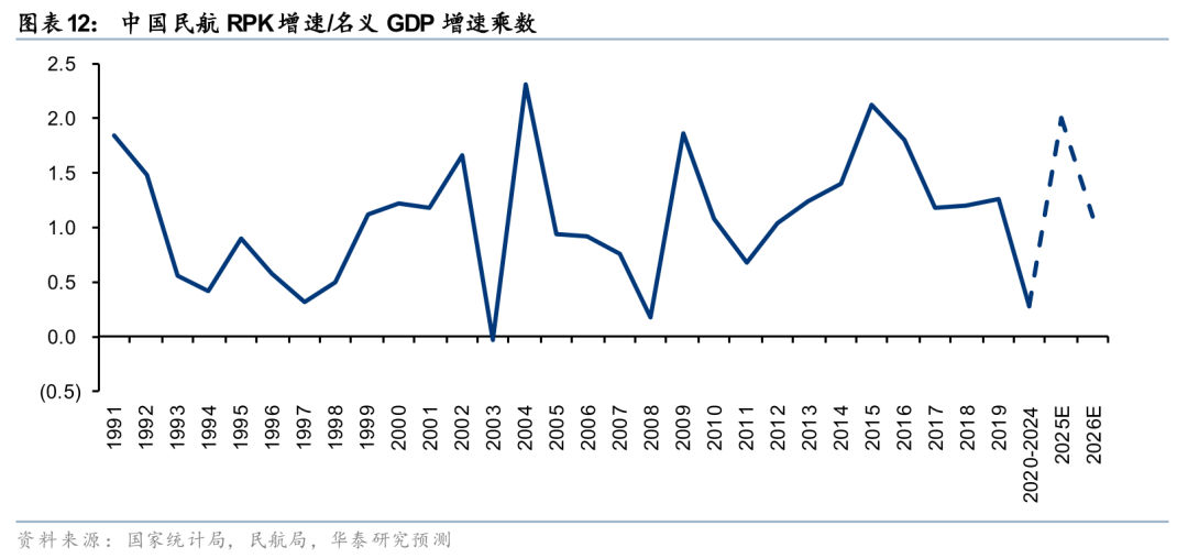 我们预测26E需求时,中性假设RPK增速/GDP增速乘数回落至1.1(1991-2019年平均数),同时根据华泰证券2025年11月03日发布的中国2026年宏观展望《重估中国:走向纵深》,我国2026E名义GDP增速为4.8%,我们预测26E民航需求同比增长5.3%,快于供给增速,有望推动行业景气改善。另外我国民航需求或存在较多超预期驱动力:1)消费/地产周期边际改善,推动GDP增速上行以及公商务需求回暖;2)国际出游及入境游刺激国际航线需求;3)银发经济、家庭出游、学生春/秋假等出行人口红利/政策释放。我们认为26E民航RPK增速与名义GDP增速乘数及需求增速存在上行风险。