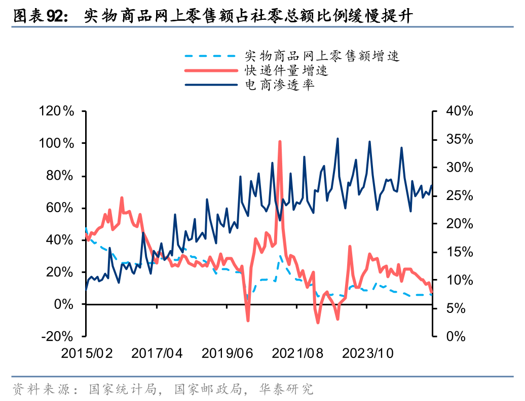 但中长期快递件量增长仍有较大空间,消费线上化进程仅过半。基于高性价比的快递服务,中国电商渗透率较高。我们估算社零中可电商化品类占比为54%,10M25累计实物商品网上零售额占社零总额比例为25.2%,中长期仍有较大空间。但考虑到线上化率超过20%后提升速度趋缓,展望26年,电商渗透率预计温和提升至27%左右。
