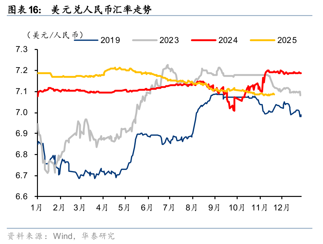 油价低位有望缓解燃油成本压力,人民币或将升值带来汇兑收益。油汇外生变量或将对航司盈利带来利好。2025年1-11月航空煤油出厂价均价为5679元/吨,同比下降10.5%。另外根据华泰化工组2025年11月18日报告《新周期渐启,新领域纷呈》,由于OPEC+实际供应增量或将集中释放,以及南美等低成本增量供给投放,全球原油供应过剩压力或将凸显,预测布伦特原油均价25E/26E为68/62美元/桶,26年同比下降9%,航司燃油成本压力有望进一步减轻。