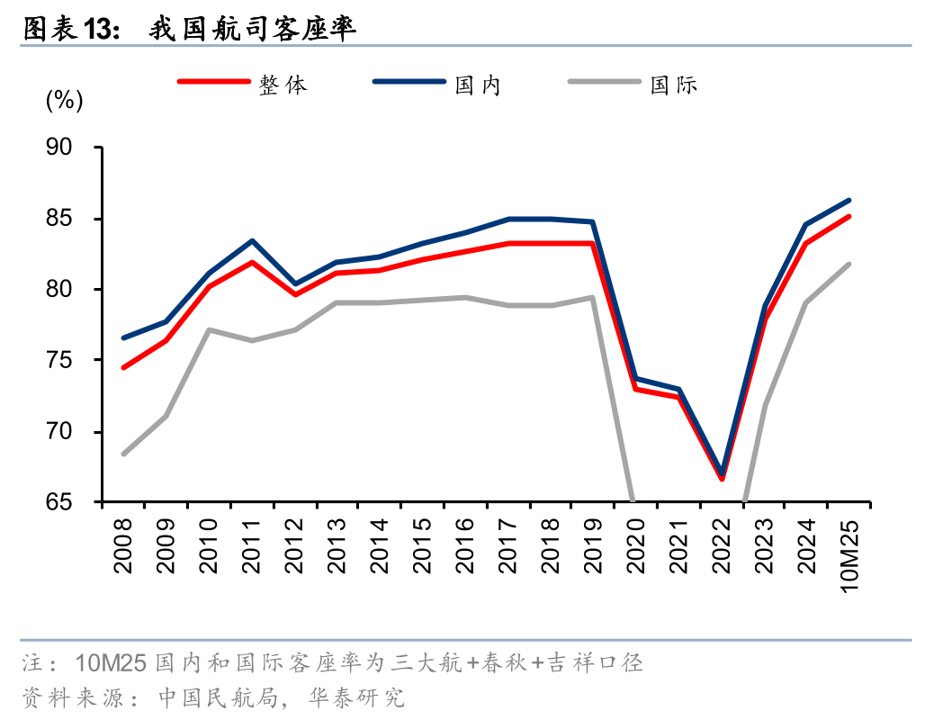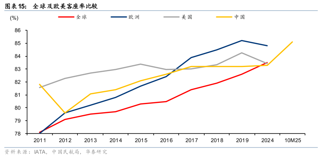 全球范围来看,2011年以后全球民航客座率处于爬升通道,2024年达到83.5%,美国客座率普遍在82%-84%波动,2019年为最高的84.2%,欧洲或由于低成本航空渗透率更高,2019年客座率达到85.2%。理论上由于旅客出行和航班时间无法完全匹配,民航客座率存在天然瓶颈,并且过高的客座率反而说明票价较低,没有实现收入最大化。我国10M25客座率达85.1%,不仅为我国历史高点,全球历史范围内也同样为较高水平,横向与纵向比较,我们认为我国航司进一步提升客座率的空间有限,叠加行业反内卷正逐步达成共识,我国航司收益管理目标有望向票价边际倾斜,之后的行业景气改善或将向票价提升传导。