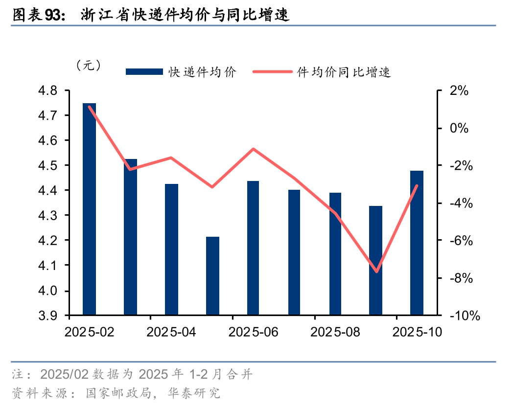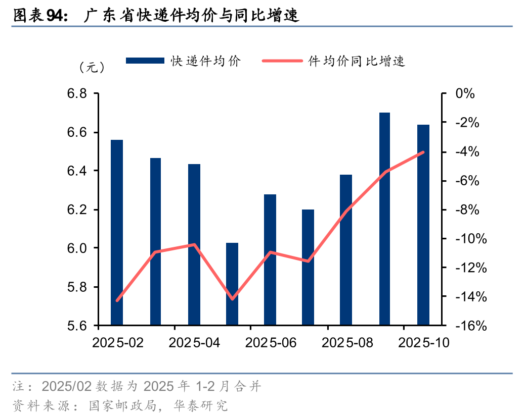 我们预计26年快递价格同比降幅收窄。25年7月开始,在“反内卷”号召下,从核心“产粮区”广东、浙江率先开启涨价等举措,随后全国主要省区均积极响应号召,自律推进反内卷政策落地,末端快递价格合理回升。我们预计26年将延续9月以来行业价格“下有底、温和波动”的趋势,价格同比降幅较25年(-4.2%)收窄至2.1%。