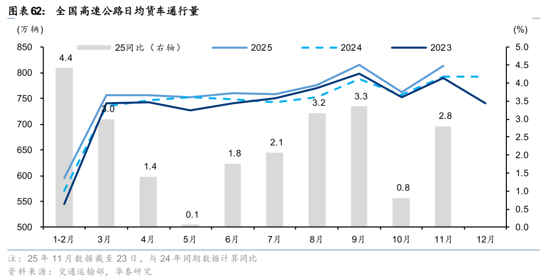 公路运价从低位回升。2023-2024年,受地产基建趋弱影响,大宗商品公路运价呈下降趋势,24年平均运价同比下降6.1%(物泊科技)。2025年H1,公路运价继续筑底,H1平均运价同比下降4.5%;但从3Q起,受“反内卷”措施提振,公路运价已从低位小幅回升,7-10月平均运价同比提高2.3%、较1-6月均价提高4.1%。公路运价直接影响货车司机对行驶高速公路(效率优先)或者普通国道(成本优先)的路径选择。3Q以来公路运价从低位回升,印证货车弱复苏状况。
