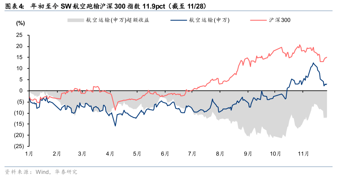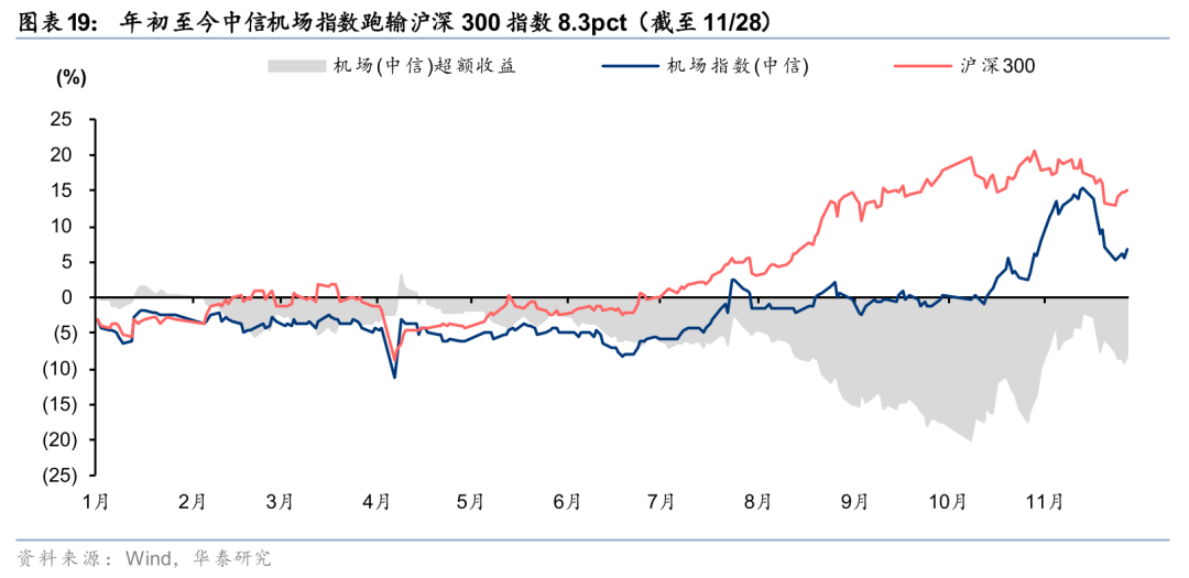 票价是航空股价波动的重要原因。25年以来,航空板块相对沪深300指数收益明显较弱,我们认为,主要受市场较为关注的票价指标波动拖累。1-8月国内线票价仅在5月同比转正,带动航空板块取得短暂相对收益。之后暑运旺季由于公商务需求受限,票价同比再次转负,使得航空板块相对沪深300指数录得较大负收益。不过10月由于票价同比持续转正,以及资金高低切需求和油价汇率趋势利好,航空板块超额收益明显。最终截至11月28日,SW航空指数年初至今跑输沪深300指数11.9pct。