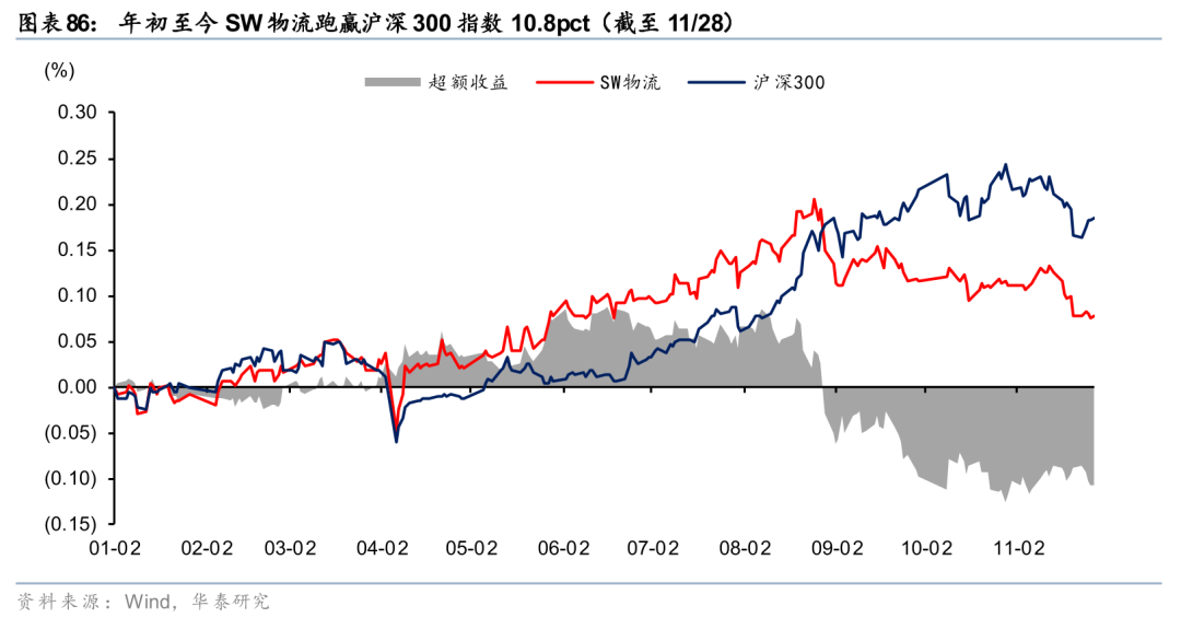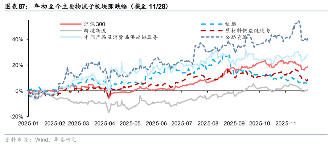 2025年初至11月28日,SW物流上涨4.8%,跑输沪深300指数10.3pct,其中,公路货运/中间产品及消费品供应链服务/原材料供应链服务/公交/仓储物流/快递/跨境物流分别+37.7%/+25.1%/+5.1%/+5.0%/+3.3%/+1.8%/-0.2%。仅公路货运与中间产品及消费品板块跑赢大盘,其余板块均表现平淡。重点子板块表现如下:1)快递:上半年关税扰动频繁,偏内需的快递相对表现相对较优;7月底开启反内卷后,电商快递个股超额收益明显;但9月至今,反内卷获利盘较重,10月以来件量表现弱,市场担忧涨价持续性,快递板块跑输大盘。2)跨境物流:关税反复带来的不确定性、T86政策取消,叠加去年高基数,整体跑输大盘。3)原材料供应链服务:上游原材料供应链与地产周期紧密相关,今年以来新经济表现更优,板块跑输大盘。中间产品及消费品供应链服务(中下游供应链)与公路货运板块中小市值、贴近题材标的居多,在流动性宽裕的环境下表现较优。