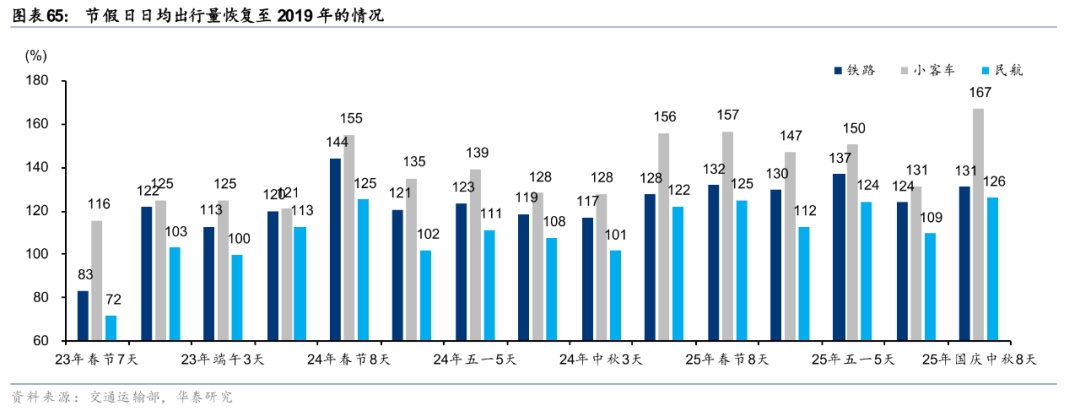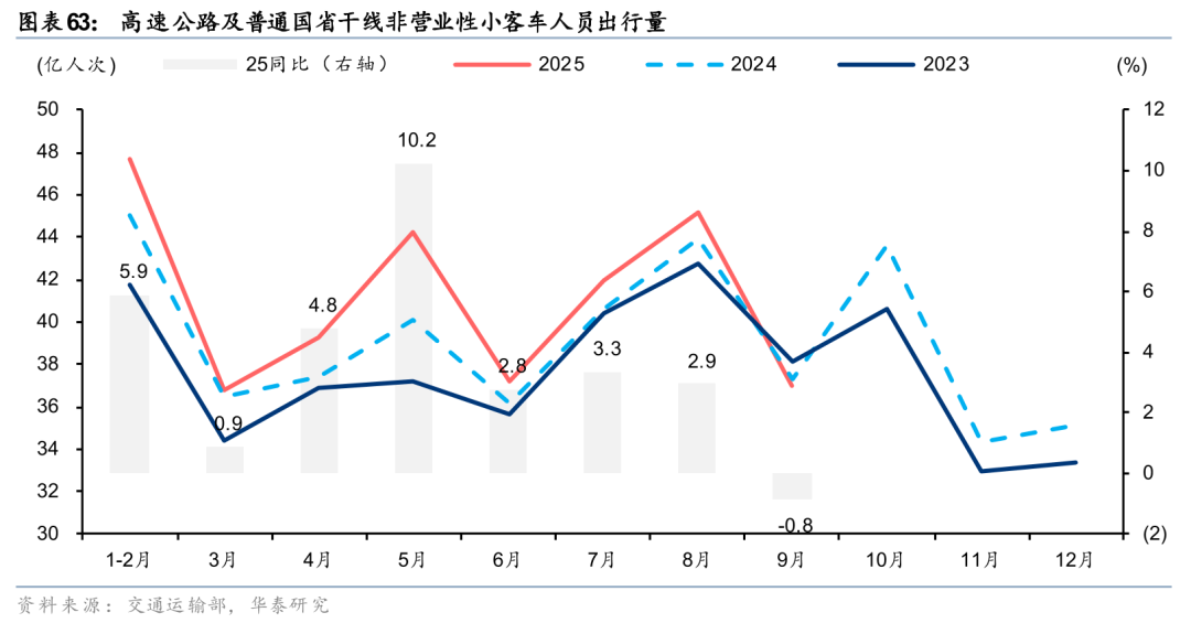 我们预计26年客车通行量有望稳健增长。居民收入与财富预期则影响出行频次。节假日出行保持较高景气度,2025年所有假期的小客车、铁路、民航日均出行量均超过2019年同期。地产去杠杆的冲击在边际缓解,财政政策的实际执行仍将积极有为,新经济对GDP的贡献进一步上升,或能通过房价稳(财富预期)、就业稳(收入预期)方式传导并促进居民出行半径扩大。