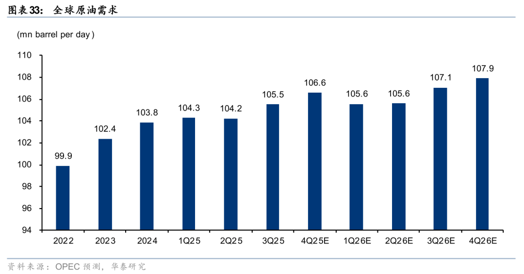 展望2026年,我们认为国际油运市场将延续景气上行周期,运价中枢较2020-2025年显著上移,推升板块盈利。需求端,根据OPEC预测(Monthly Oil Market Report Nov 2025版),伴随全球经济温和改善,2026年全球石油需求有望提升至1.065亿桶/天,同比增长1.3%。全球石油产量方面,除OPEC+增产外,2026年长航距出口国如北美/巴西/阿根廷等原油出口量有望增加,进一步推动油轮吨海里运输需求。