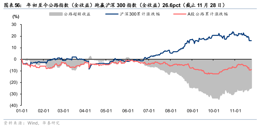市场风险偏好上行,使A股公路板块跑输大盘。2025年初至11月28日,公路指数(全收益)下跌8%,跑输沪深300指数(全收益)约27百分点,主因市场风险偏好上行、板块估值吸引力下降。同期,中国10年期国债收益率从年初的1.68%震荡上行至11月28日的1.84%,10年期AAA企业债收益率与国债的信用利差从44bp扩大50bp。2025年初至11月28日,公路指数(全收益)跑输中证红利指数约13个百分点。资金在红利子板块里更偏好有顺周期逻辑、股息率更高、盈利更稳定、公募欠配的银行板块。同期,银行指数(全收益)已上涨约9%。公路板块在经历两年半重估后(2022年初至2025年初,公路指数(全收益)已上涨68%),龙头股的股息率偏低,较其他红利股票的吸引力下降,也引起资金获利了结。