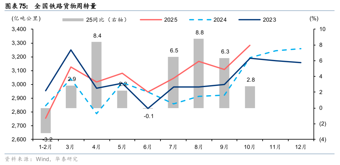 铁总大力发展物流总包,非煤大宗品运量快速增长。2025年1-10月,全国铁路货运量、货物周转量分别同比+2.6%、+3.1%。分货种看,2025年1-10月,国家铁路完成煤炭运量17.32亿吨,其中电煤运量11.78亿吨,冶炼物资、粮食发送量同比分别增长9.1%、13.8%。铁总大力发展物流总包服务,前10个月,国家铁路累计发送铁水联运集装箱货物1425.8万标箱、同比增长16.2%。在开展物流总包业务初期,“降价获量”可能使盈利指标偏弱。