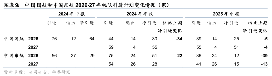 机队引进计划存在下调可能。上市航司飞机引进计划普遍在财报披露,并且会由于交付节奏、飞机批文、退出手续完成等因素,造成航司净引进飞机架数计划改变。如前文所述,当前飞机制造商产能尚未完全恢复,叠加国际贸易环境波动,航司机队引进不仅完成率有待提高,并且或将造成引进计划的调整。我们回顾了中国国航和中国东航近三期披露计划,净引进数量整体呈现下降趋势,其中26年的预计净引进数量,24年报vs24中报下降12架,25中报vs24年报进一步下降44架;27年的预计净引进数量,25中报vs24年报下降17架。