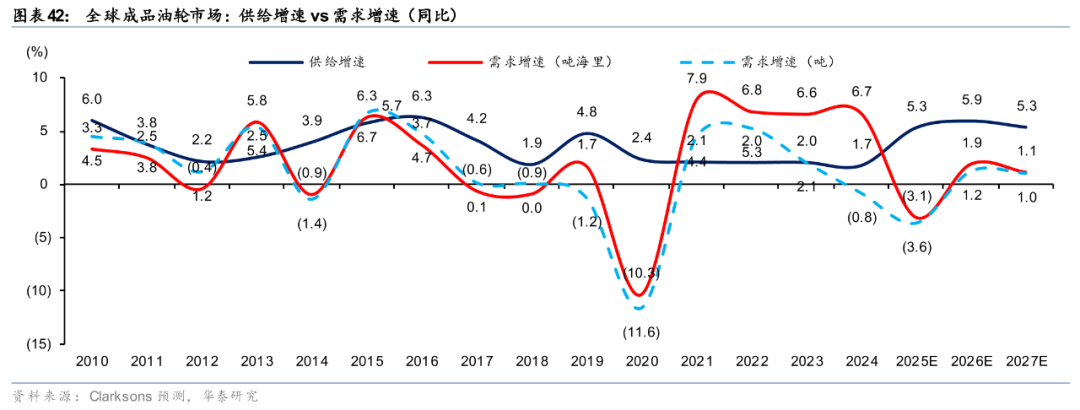 成品油轮方面,Clarksons预测25/26/27年全球成品油轮名义运力同比增长5.3%/5.9%/5.3%。需求方面,Clarksons预计25/26/27年全球成品油轮货物周转量(吨海里)增速-3.1%/1.9%/1.1%,货量(吨)增速为-3.6%/1.2%/1.0%。