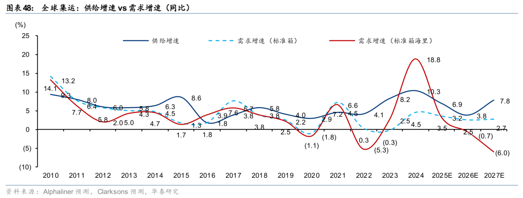 需求方面,行业货量需求受益于全球产业重塑,整体或有望平稳;吨海里需求受红海是否通行影响,或存下行风险。根据Clarksons预测,25/26/27年全球集运货量需求同比增长3.5%/2.5%/2.7%,但运输周转量(吨海里)同比+3.2%/-0.7%/-6.0%,主因考虑红海若恢复通行对运距缩短的负面影响。