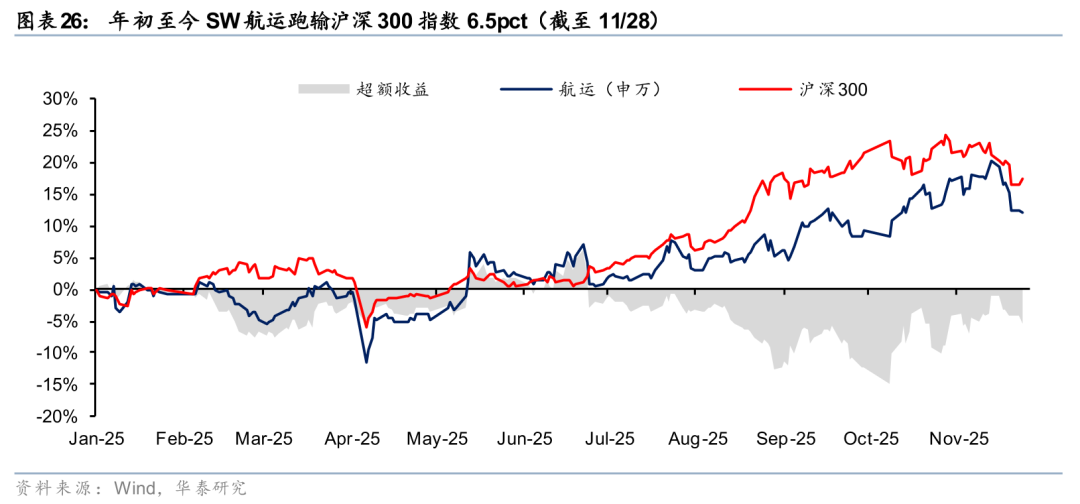 2025年1月1日-11月28日,航运(申万)指数上涨12.0%,跑输沪深300指数6.5pct,主因下半年以来大盘整体走强,而航运板块受中美关税政策及地缘事件反复扰动,股价波动加剧。细分板块看,油运自三季度以来,受益于VLCC运价大幅上涨,股价表现突出;集运运价自三季度以来大幅回落,股价回吐上半年涨幅;干散运价自三季度以来环比走强,推涨股价。