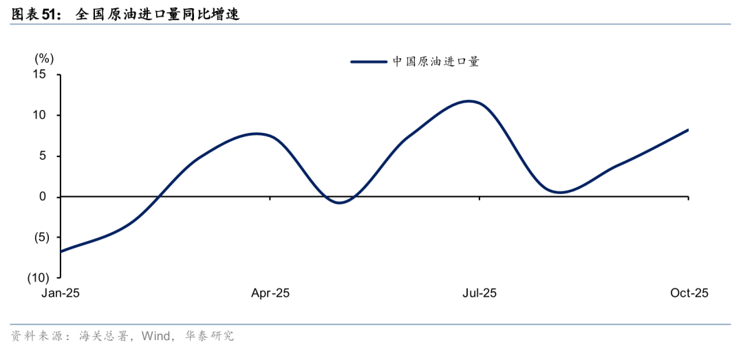 除经济改善带动用油需求增长外,油价下跌有望带动行业进入补库周期,26年VLCC运价有望维持高位。年初至今(1.1-11.28),布伦特油价均值为68.6美金/桶,同比下滑14.6%,带动补库需求有所增加。根据OPEC数据,截至9月30日OECD原油库存为40.9亿桶,同比增加1.2%;根据EIA数据,截至11月28日,美国原油库存为8.4亿桶,同比增长2.3%;根据中国海关总署数据,25年1-10月,中国累计进口原油量4.7亿吨,同比增长3.3%。