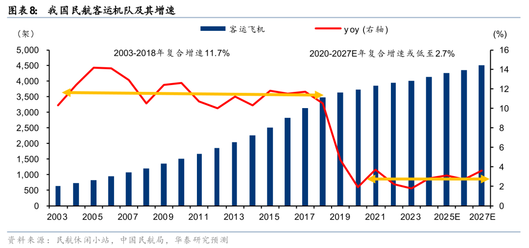 2026E/2027E机队增速或低至2.7%/3.6%。测算机队增速时,2025年假设按1-10月比例继续交付,2026/2027年上市航司我们按照公告机队引进计划,并且考虑到上游制造商产能处于恢复过程中,我们假设三大航2026/2027年引进完成率为85%/90%,其余上市航司引进完成率为100%,未上市航司2026/2027年机队增速与2025E相同,则2024/2025/2026年我国客运机队将达到4254/4369/4527架,同比分别增长3.1%/2.7%/3.6%,2020-2027E复合增速仅为2.7%,相比2003-2018年复合增速11.7%大幅下降。