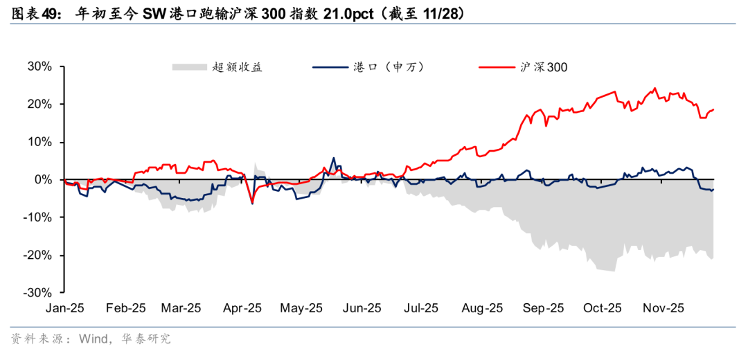 1月1日至11月28日,港口(申万)指数下跌2.5%,跑输沪深300指数21.0pct。港口大幅跑输,主因港口属于基础设施,具备防御属性,基本面整体平稳,股价表现更多受市场资金风格驱动。下半年以来,大盘整体风险偏好抬升,港口防御属性相对跑输。