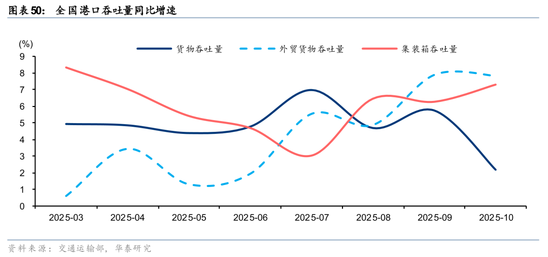吞吐量方面,尽管受关税扰动,但整体港口吞吐量表现仍显韧性。根据交通运输部数据,1-10月,全国港口累计货量/外贸货量/集装箱吞吐量同比表现+4.3%/+3.7%/+6.4%。出口集装箱吞吐量表现向好。进口方面,1-10月,中国累计进口铁矿石/煤炭/原油量同比+0.6%/-10.9%/+3.3%,其中煤炭进口量表现不佳,主因受需求偏弱叠加进口政策限制等。