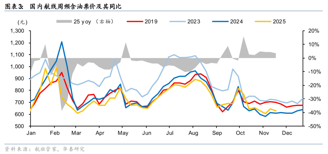 2025年1-10月航司客座率表现突出,收益水平整体较弱。2025年1-10月,三大航(中国国航、中国东航、南方航空,下同)+春秋+吉祥整体供/需分别同增5.3%/7.7%,客座率84.8%,相比24年同期的高点进一步提升1.9pct,相比19年同期增长1.9pct。但航司收益水平较弱,主因:1)公商务需求偏弱,2)航司间竞争较为激烈,将客座率作为更重要的指标。根据航班管家数据,2025年截至第47周(2025/11/23)国内航线含油票价为743元,同比下降5.2%。不过9月以来,或由于公商务需求回暖、中秋国庆假期旺季、行业反内卷、基数较低等因素,国内航线含油票价同比转正,同比提升3.2%。