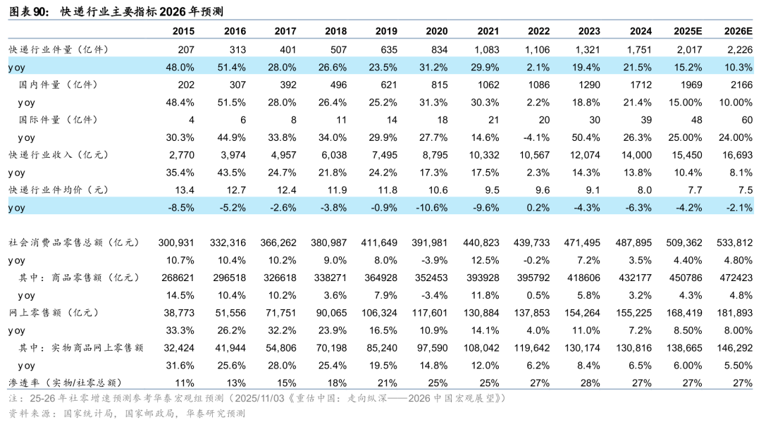 我们预测26年快递行业件量同比增速为10.3%,件均价同比降幅为2.1%。