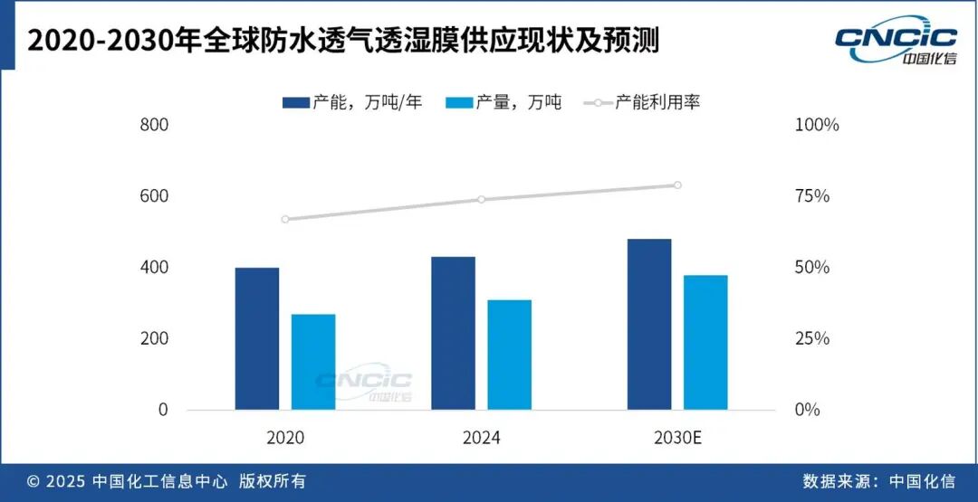 2024年全球防水透湿膜总产能约为430万吨/年,产量约为310万吨,该行业内部多以产定销,产量基本等同于消费量,2024年全球防水透湿膜市场规模约为75亿美元。2020—2024年,全球防水透湿膜总产量保持平稳增长,年均增速为3.5%。预计2025—2030年,年均增速仍将维持在3.5%左右,与过去5年基本持平,到2030年,全球防水透湿膜总需求量将达到380万吨。