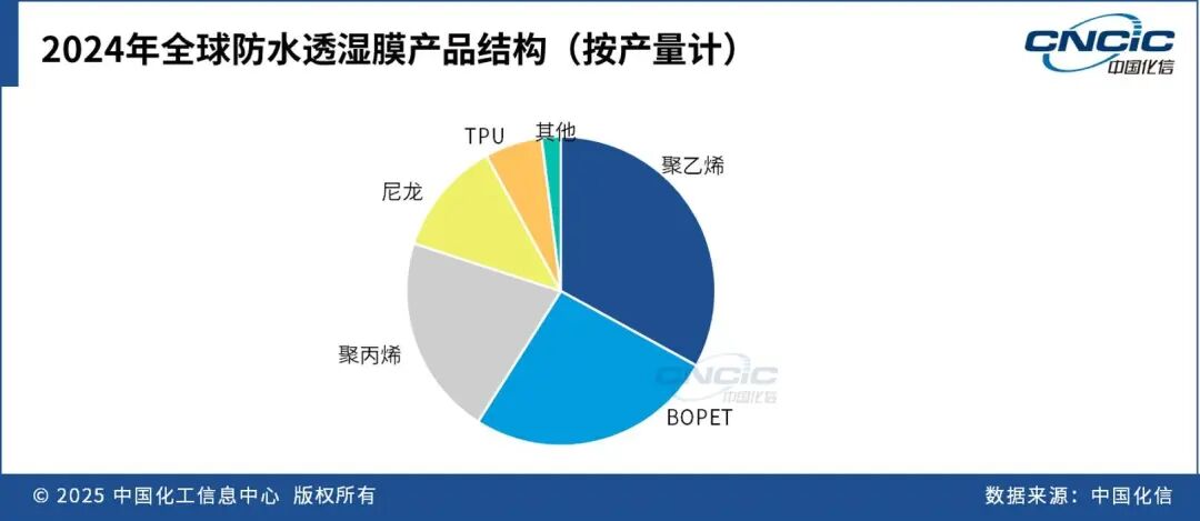 2024年全球防水透湿膜在户外面料/服装应用领域的消费量约为11万吨,市场规模约6.7亿美元。按消费量计,消费量最大的是TPU膜,其次为PTFE膜;按消费额计,消费额最大的是PTFE膜,其次为TPU膜。