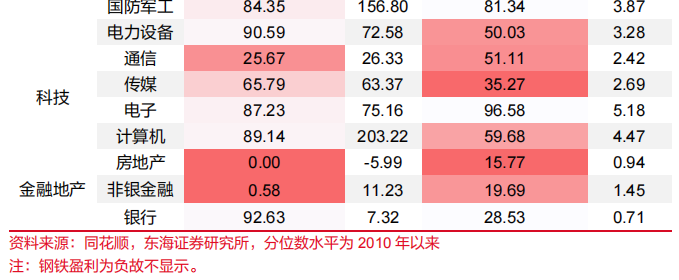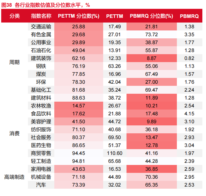 主要行业估值(PE)分位数水平:周期:交通运输<有色金属<公用事业。消费:农林牧渔<食品饮料<美容护理。高端制造:家用电器<机械设备<汽车。科技:通信<传媒<电子。金融(PB):房地产<非银金融<银行。