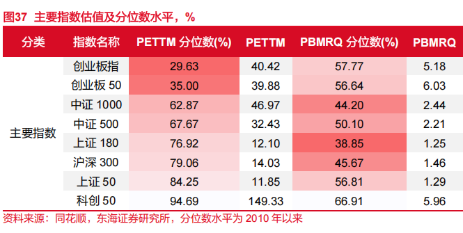 主要指数估值(PE)分位数水平:创业板指<创业板50<中证1000<中证500<上证180<沪深300<上证50<科创50。