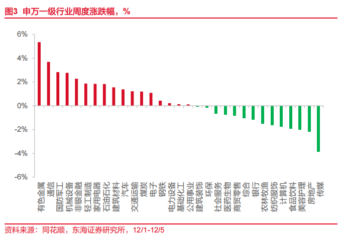 国内权益市场。12月5日当周,风格方面,周期>成长>金融>消费,日均成交额为16843亿元(前值17254亿元)。申万一级行业中,共有17个行业上涨,14个行业下跌。其中,涨幅靠前的行业为有色金属(+5.35%)、通信(+3.69%)、国防军工(+2.82%);跌幅靠前的行业为传媒(-3.86%)、房地产(-2.15%)、美容护理(-2.00%)。