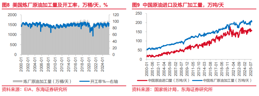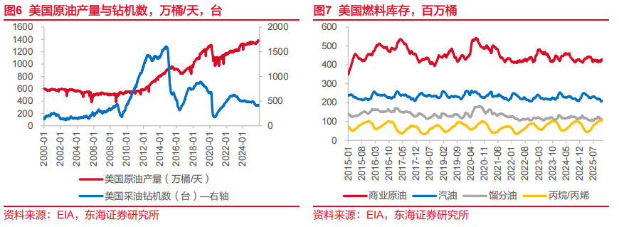 截至12月5日当周,WTI原油周内震荡反弹,收于60.08美元/桶,较上周同期微涨2.6%。截至2025年11月28日当周,美国原油产量为1381.5万桶/天,同比增加30.2万桶/天。美国炼厂吞吐量为1687.6万桶/天,开工率94.1%。12月5日当周,美国钻机数549台,较去年同期减少40台;其中采油钻机数413,较去年同期减少69台。