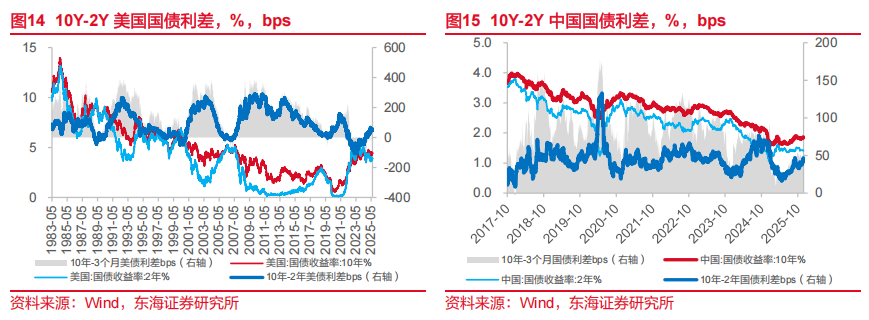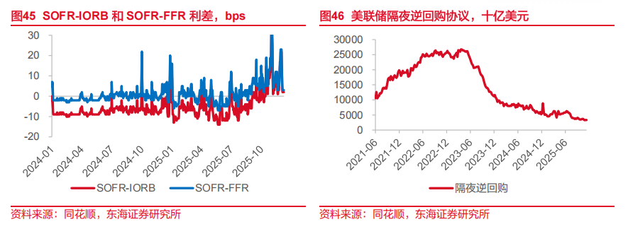 市场流动性方面,SOFR与政策利率利差虽较上周小幅回落,但仍处于年内高位,且交易量仍有放大的迹象,表明货币依然偏紧。一方面长债发行力度加大对流动性形成吸纳。11月中旬联邦政府恢复运营后,虽然TGA余额因短期支出脉冲而下降,但随着近期国债发行力度较大(财政部继续执行重建TGA与为赤字融资计划),周内TGA账户余额再度上升至9000亿美元上方。虽然TGA最剧烈的重建阶段已经过去,但短期内赤字规模难以大幅收缩,意味着为赤字融资的发债压力仍然存在。另一方面,日本加息预期发酵,驱动资金流向日本。12月初美联储已结束缩表,12月中旬降息有望落地,美联储是否扩表也值得关注,市场或迎来观察流动性能否实质性改善的重要窗口。