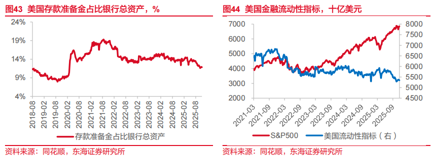 从量的角度来看,截至12月3日当周,美国金融流动性较为平淡,随着美联储结束缩表,市场从上周紧张流动缓和过来。TGA账户当周小幅上升88.4亿美元,我们认为是属于在圣诞前政府支出的正常筹备和波动。当周流动性几乎全部来源银行系统存款准备金,其账户减少198.2亿美元,带动银行准备金对总资产占比下行来到11.9%,再次向下突破12%“充足水平”,美国金融流动性依然难言宽松。