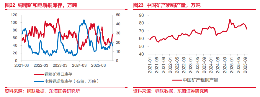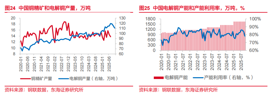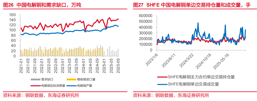 2025年10月,我国电解铜产量约为110.61万吨,环比减少3.8%,同比增幅12.9%,生产能力复苏较上期略有下滑,但下游需求维持旺盛状态。2025年10月,我国电解铜年化平均产能为1648万吨,产能利用率为78.18%。2025年9月我国电解铜产量和需求缺口约为29.04万吨,缺口较上期环比扩大39.95%。我国进口电解精炼铜总量基本可以覆盖生产需求缺口。