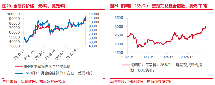 2025年,金属精炼铜价格震荡上行,12月5日当周,SHFE电解铜连续合约结算平均价格为89808元/吨,较上一周价格环比上升3.6%,价格与去年同比增长19.5%;LME伦铜3个月合约结算价为11301.75美元/吨。12月5日当周,我国铜精矿干净料(25%Cu)远期现货综合价格指数约为3030.4元/千吨,价格环比上升4.1%。全球供应紧张预期进一步强化,以及市场资金面与宏观环境的双重支撑。具体来看,由于主要产区矿山供应扰动、市场对原料短缺的担忧加剧,使精矿价格抬升;加之美元走弱及降息预期升温,资金回流大宗商品,推高现货与远期铜价。