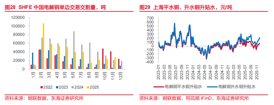 2025年12月5日当周,我国SHFE电解铜持仓量为230671.2手,环比上升12.5%;成交量为357105手,环比上升87.2%,全球供给紧张预期加剧、现货库存被抽走、国际贸易商集中提货,叠加资金面宽松与套利、配置需求上升,导致成交量出现大涨。2025年11月,沪铜单边交易交割量为28000吨,高于去年同期交割水平。