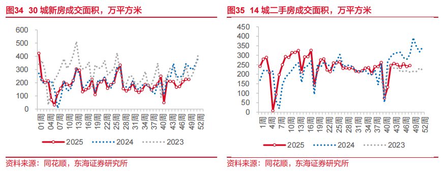从价的角度来看,截至12月3日,SOFR-IORB由上周同期15bp下降至5bp,显示银行间货币回购市场流动性紧张程度暂缓,但依然处于0值以上,符合我们上周对美联储结束缩表作用有限的判断。住房市场上,受到当周市场消息“下届美联储主席内定哈塞特”的影响,关键住房贷款利率再度下行。30年期和15年期住房抵押贷款利率分别下行4bp和7bp至6.19%和5.44%水平。