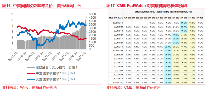 1)美元降息与日元加息预期,资产再平衡下寻找确定性。过去一周,资产围绕美元降息与日元加息的预期波动,债券和商品表现相对敏感,其中美债、日债收益率上行较多,黄金小幅回落,铜价强势上行。新的一周,12月11日美联储利率决议,降息的理由主要在于劳动力市场,尤其是在ADP就业报告显示私营部门就业岗位减少之后。12月19日,日本央行利率决议,市场或对加息预期逐步消化。从资产配置的角度,中美利差收窄,预计人民币仍处于有利位置。我们认为市场将会寻找确定性,相较于1980年和2011年黄金两次长期历史高点时,目前美元指数仍有下行空间,将会支撑金价;虽然美联储降息节奏存在分歧,但是2026年仍处于降息周期;日元升值,或有利于国内的出口;资产配置方面国内的权益市场确定性强,建议有色资源板块、芯片科技板块、出口板块、红利板块等。