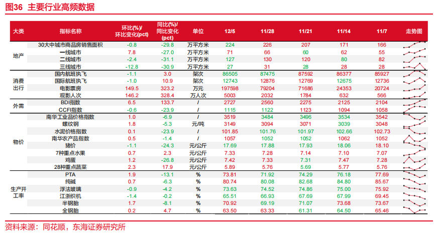 全球大类资产回顾。12月5日当周,全球股市多数上涨,A股表现相对较好;主要商品期货中铜、原油、铝收涨,黄金收跌;美元指数小幅下跌,非美货币升值。1)权益方面:创业板指>沪深300指数>深证成指>恒生科技指数>纳指>恒生指数>德国DAX30>道指>日经225>上证指数>标普500>科创50>法国CAC40>英国富时100。2)当周美债收益率上升影响金价表现,黄金震荡回落;原油受地缘政治冲突升级影响当周小幅震荡上行。3)工业品期货:南华工业品价格指数上涨,螺纹钢、水泥小幅上涨,炼焦煤、混凝土小幅回落;高炉开工率当周下跌;乘用车当周日均零售7.54万辆,环比上涨25.39%,同比下跌7.00%;BDI环比上涨6.52%。4)国内利率债收益率涨跌不一,全周中债1Y国债收益率下跌0.01BP至1.4016%,10Y国债收益率上涨0.68BP收至1.8480%。5)美日国债收益率普遍上行。2Y美债收益率当周上行9BP至3.56%,10Y美债收益率上行12BP至4.14%;10Y日债收益率上涨12.7BP至1.9390%。6)美元指数收于98.9833,周下跌0.46%;离岸人民币对美元升值0.03%。