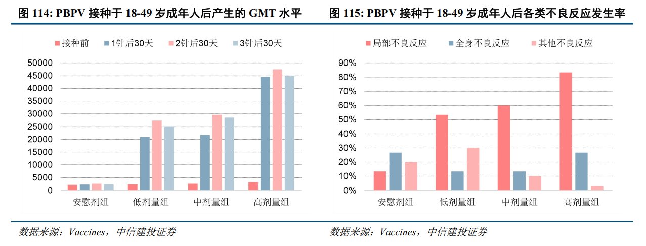 PBPV:实现广阔血清型覆盖率,康希诺PBPV临床I期结果积极。康希诺自主研发的PBPV(肺炎球菌蛋白疫苗)采用基于肺炎球菌表面蛋白A(PspA,一种几乎所有肺炎球菌表达的高度保守蛋白)为抗原。与现有肺炎疫苗相比,PBPV具有更高血清覆盖率(至少98%的肺炎球菌株覆盖率),可以有效防止“血清型替代”的产生。同时本产品生产工艺更为简便,易于放大和质量控制。PBPV还可诱导T细胞依赖性免疫反应,对婴儿和老年人预计都有良好的免疫反应。康希诺开展了针对PBPV的Ia期及Ib期临床研究,结果表明,PBPV在成人及老年人群中具有良好的安全性,单剂接种即可诱导显著的结合抗体,以及针对跨家族/亚类肺炎链球菌的功能性杀菌抗体应答,进一步证明了该候选疫苗的广谱性和潜在公共卫生价值。公司将基于I期临床试验中获得的初步结果,进行下一阶段PBPV研发工作的评估和规划。