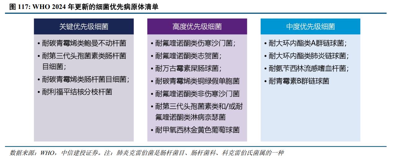 康泰生物布局肺炎克雷伯菌疫苗,填补全球研发空白。肺炎克雷伯菌是临床中耐药性与致病力极强的细菌之一,尤其是对碳青霉烯类抗生素耐药的肺炎克雷伯菌(CRKP),几乎对目前所有一二线抗生素耐药。世界卫生组织发布的《2024年细菌类重点病原体目录》中,碳青霉烯耐药肺炎克雷伯菌被列为关键优先级。2025年8月,康泰生物与陆军军医大学邹全明教授团队签署肺炎克雷伯菌疫苗项目技术转让合同,转化金额5.3亿元,按里程碑付款。目前已经完成成药性研究和初步安全性评价,在肺炎模型中对肺炎克雷伯菌临床菌株感染的保护率稳定大于80%,具有良好的有效性及广谱性。