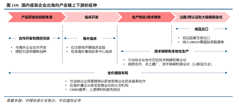 疫苗出海从成品出口向价值链上下游延展。随着疫苗企业出海事业持续推进,出海动作也在价值链上下游加速延展深化。从单一的双边注册出口成品向灌装技术转移、海外建厂商业化生产、开展海外临床试验、海外合作研发或者授权早期品种等,逐步从下游向上下游全链条过渡。