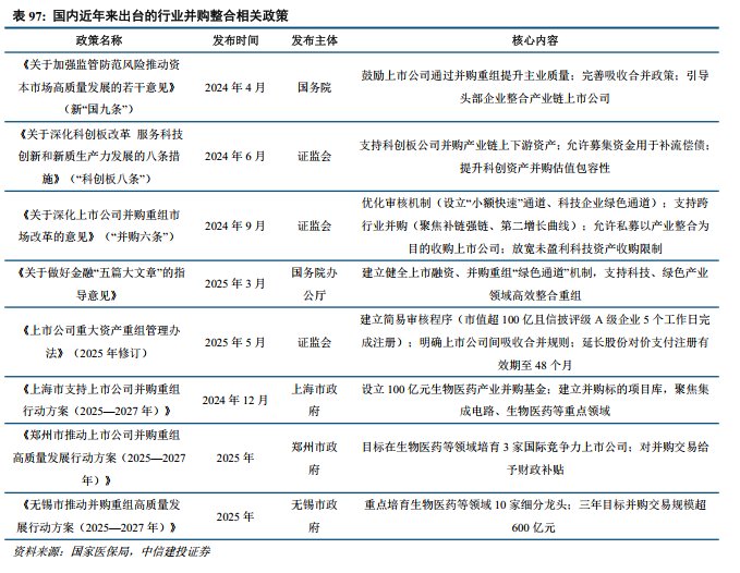行业并购相关政策陆续出台,重点关注医药领域。近年来,国内围绕行业并购整合出台了一系列顶层设计与地方配套政策,形成“中央引导+地方落实”的政策体系,重点支持科技领域补链强链、传统产业升级及产业链协同整合,并简化并购重组交易相关审核流程,允许使用创新支付工具,增强监管包容。从各地政策来看,生物医药、电子科技等领域成为鼓励并购重组的重点行业,有助于疫苗行业的实现并购整合,提高行业集中度的同时减少无序竞争,促进行业健康发展。