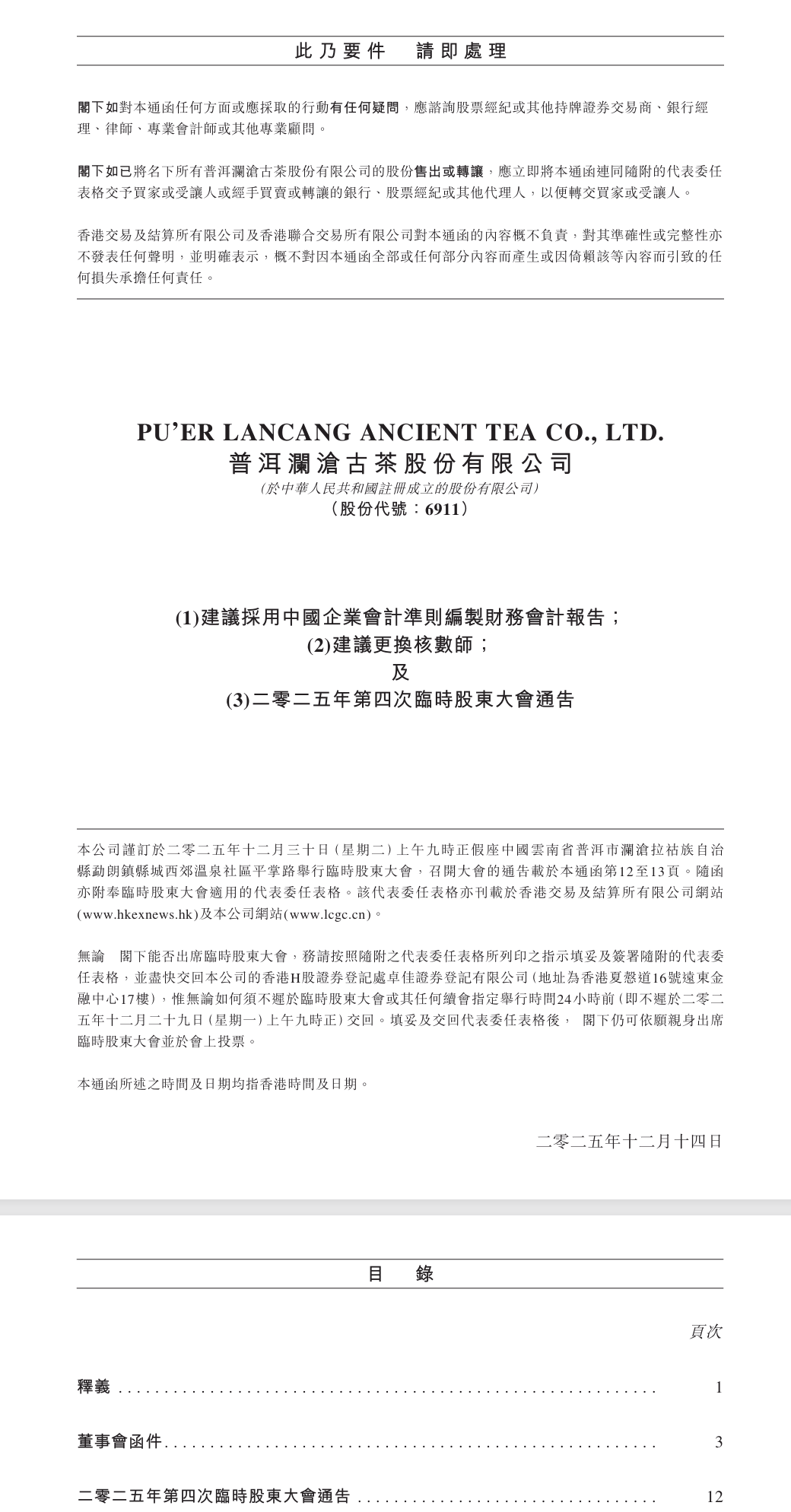 普洱澜沧古茶股份有限公司(股票代码:6911)发给股东的一份重要通知。核心内容是公司要召开一次临时股东大会,投票决定两件大事,并告诉你作为股东需要做什么。