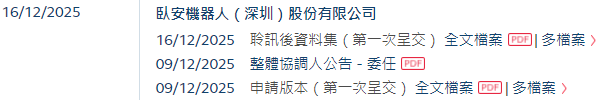 2025年12月16日,来自广东深圳宝安区的卧安机器人(深圳)股份有限公司 OneRobotics (Shenzhen) Co., Ltd.(简称"卧安机器人")在港交所递交招股书,拟在香港主板挂牌上市。这是继其于2025年6月8日、2025年12月9日先后两次递表。