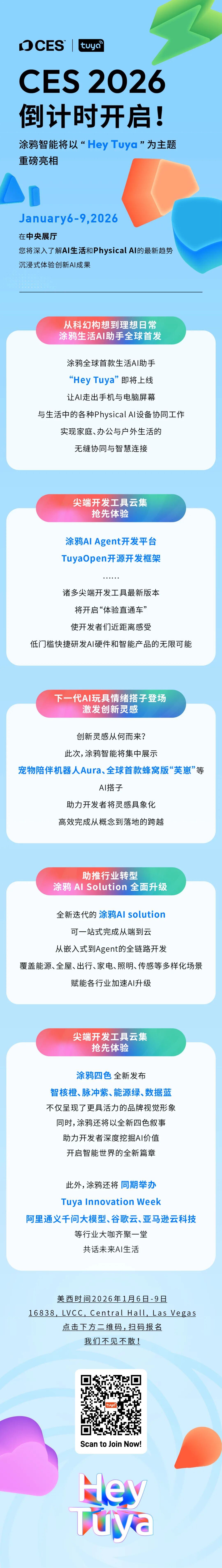 涂鸦智能(纽交所代码:TUYA;港交所代码:2391)是全球领先的AI云平台服务提供商,致力于将AI应用于生活,通过AI Agent开发平台、TuyaOpen开源开发框架等通用AI Agent引擎,集成多模态AI能力,降低AI开发门槛,高效推进AI生活实现,加速AI与物理世界的深度融合。涂鸦智能具备云计算及空间智能等能力,为智能设备、商业应用和行业开发者提供了全新物理AI技术解决方案,以及开放中立的全球化生态,激发了一个由品牌、原始设备制造商、AI Agents、系统集成商和独立软件供应商组成的充满活力的全球开发者社区,共同打造绿色低碳、安全、高效、敏捷和开放的智慧解决方案生态。