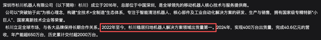 这家由大族激光孵化、海尔集团作为战略股东的企业,早已是扫地机器人代工领域的领跑者。业内有这样一句说法:全球高端扫地机器人市场里,每十台就有三台来自深圳杉川。官网数据显示,2024年杉川实现400万台出货量,完成40.6亿元的营收,年产能超650万台,历史累计交付超2000万台。